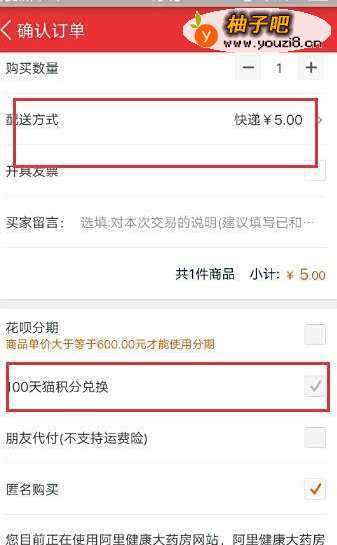 6如图所示,商品价格显示0元+100天猫积分。但请注意本款商品还需要一个运费5元,目前有一部分全额兑换的商品需要加运费。请各位在兑换之前看清楚细则。点击立刻购买。