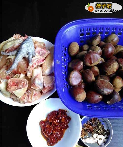 备好原材料:提前处理好的鸡肉,板栗,豆瓣酱,八角,山奈,花椒,姜蒜,干辣椒。