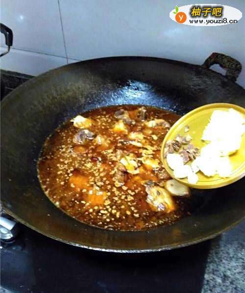 8倒入适量清水,放入八角、山奈、姜片、蒜瓣,煮出香味。