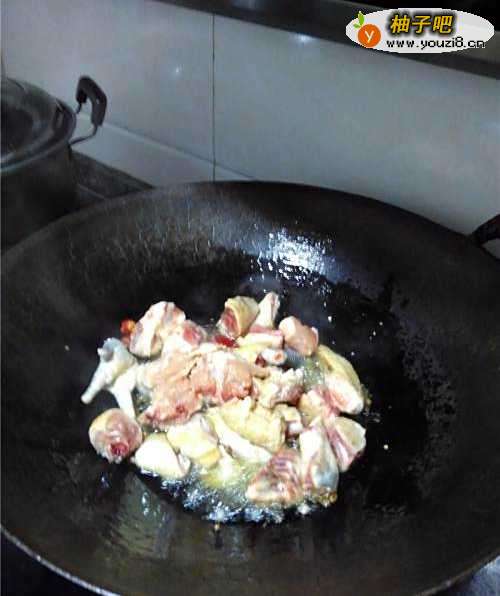 7鸡肉炒变色后,放入豆瓣酱,酱油,翻炒均匀。