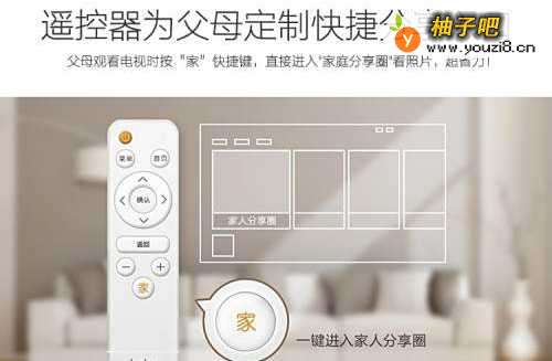 4爱奇艺 桔豆盒子的遥控器除了按键做大做少之外,还定制“家”快捷键。爸妈如果在家看着电视,孩子正巧传了张照片过来,电视屏幕右上方会有提示,这时只需按一下遥控器上“家”键,就会切换到照片分享界面,还能原样返回,对老年人来说很省力。