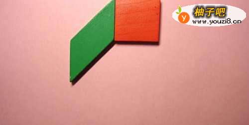 2先取红色的正方形板与绿色的平行四边形板连接,摆放在纸上,拼接位置,如下图所示。