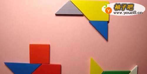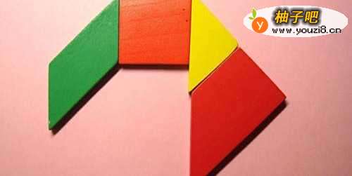 3接着,取红色梯形板与橘色三角形板连接,并摆放在红色正方形板的右边,拼接位置,如下图所示。