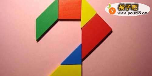 6最后,取蓝色的三角形板与紫色的三角形板连接,并摆放在白色三角形板的右边,拼接位置,如下图所示。这样数字2的图形就拼好了。可以让孩子仔细看一遍后,自己动手拼图,并不断回忆拼图的顺序,这可以锻炼孩子的记忆能力。培养孩子的过目不忘的能力,对孩子以后的学习有帮助。