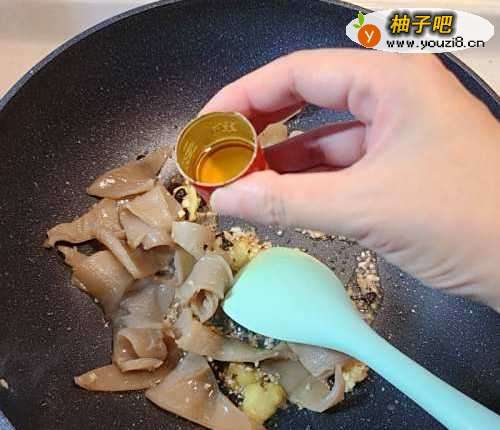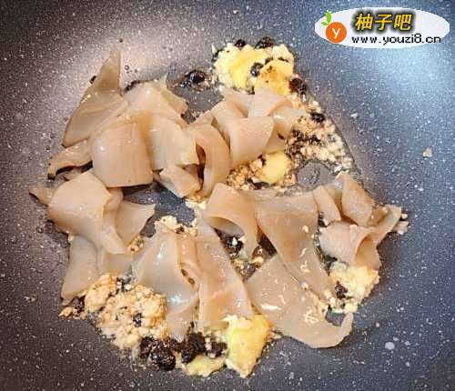 2放少许油下锅先炒生姜、豆豉及蒜蓉,后放入象鼻蚌翻炒。