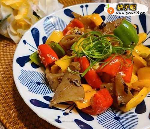 4最后加入彩椒翻炒,并加入调味料炒匀便可装盘。