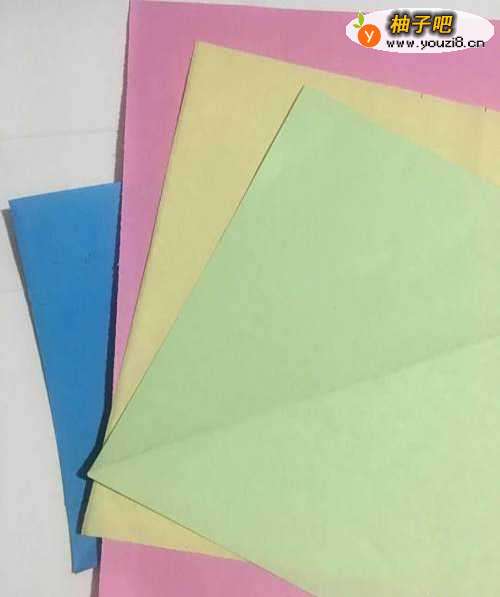 3第三步 搭在一起之后 按反正面扣上即可 然后再折叠一个助转器 先把一张11厘米的正方形彩纸对角线折叠后取开 四个角向里折叠两次