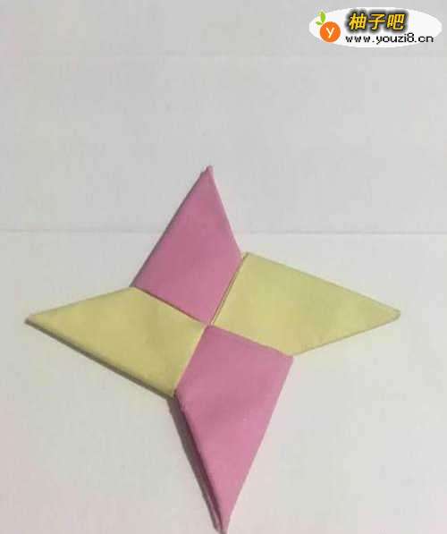 2第二步 折叠完之后 再用同样大小的黄色彩纸反方向折一个 然后把这两个的四个角都折成飞镖形状 搭在一起