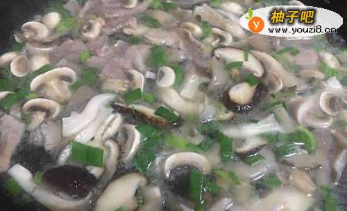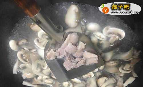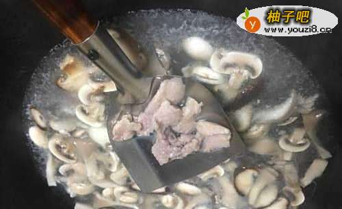 6煮开之后下入腌制好的瘦肉,用锅铲划开