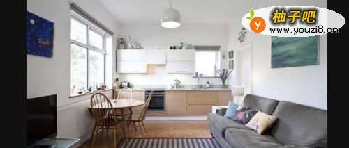 5户型极小时,可以将其结构改造成厨房、餐桌、客厅为一体的装修,如下图所示,这样装修使房间宽敞通透,并使用价值也非常高。