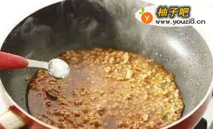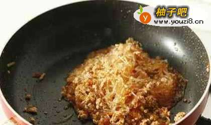 2锅内倒油,爆香葱姜蒜后倒入肉沫,煽炒出油来