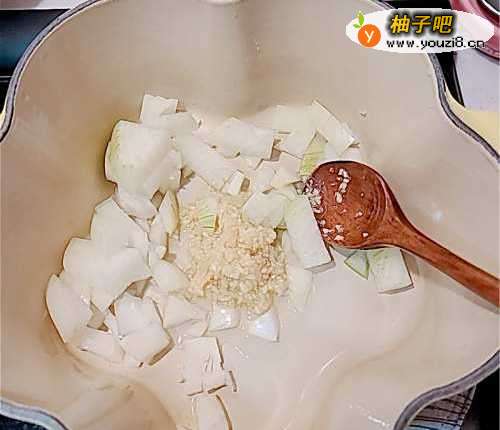 2下橄榄油先炒香蒜蓉和洋葱变软。