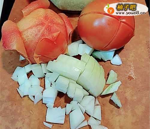 蕃茄洗净去蒂,并在表皮上轻轻划上十字,放入大滚水约1分钟,捞起后去皮切粒备用。洋葱切粒。