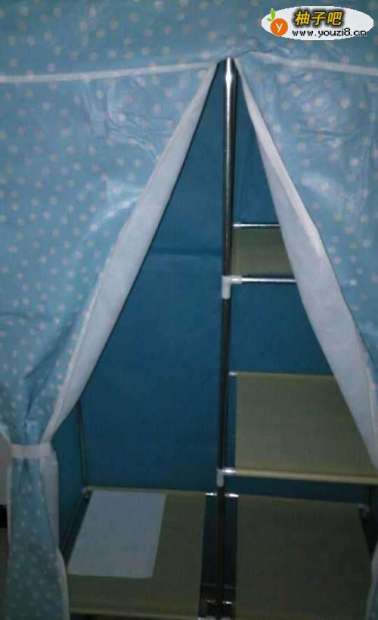 10搭建好后,我们套上布套,安上塑料圆钩,这样一个简易的衣柜就搭建好了。