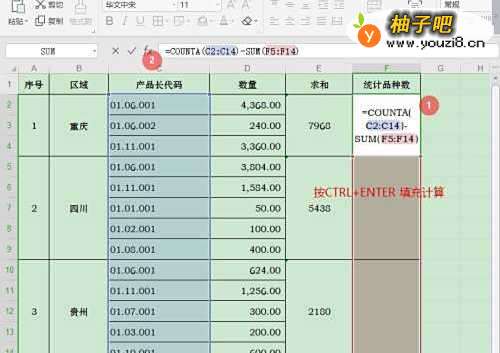 2选择数据表格区域【F2:F14】;