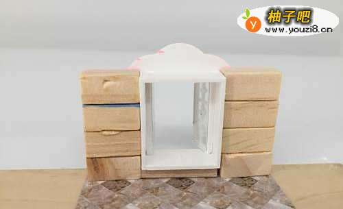 3在两边粘好木块,再粘门,门的两边一样粘上木块,然后在门、窗上面粘上三角板、三角板上粘上长方形木片当瓦片。
