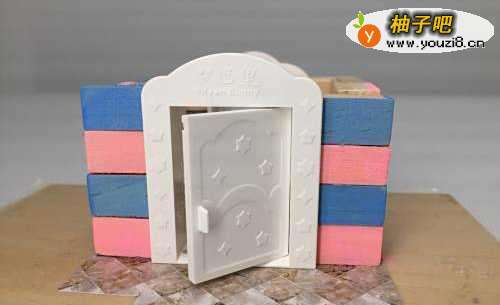 4然后贴点湖水纸,粘上树,铺上草粉。在门口、周围摆上动物及娃娃。漂亮的房子就完工了。