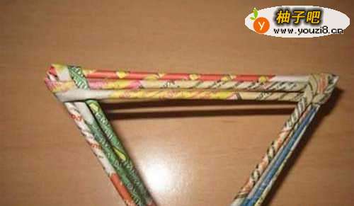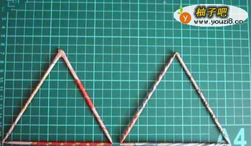 把所有用到的废纸都卷成细长的纸棍。接着,选择其中两根纸棍,收尾相接并用胶水粘结,做成两个等边三角形。