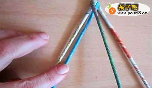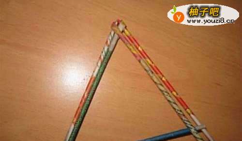 2拿起第一个等边三角形,再拿出一根长纸棍,开始进行编织,DIY六角星挂饰的基础是手编三角形,以下是它的编织起手式