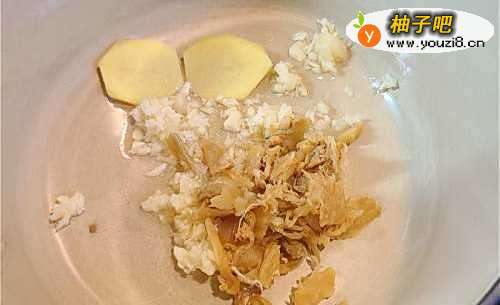 2热锅下油放入姜片、蒜蓉和冬菜炒香。