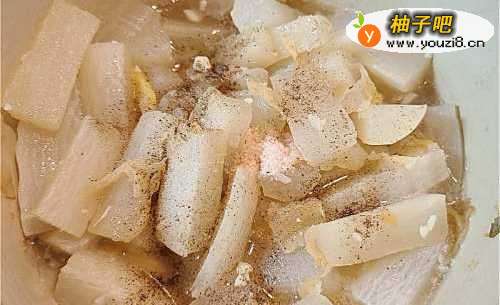 5下煎好的鱼肉和胡椒粉拌匀煮一会。