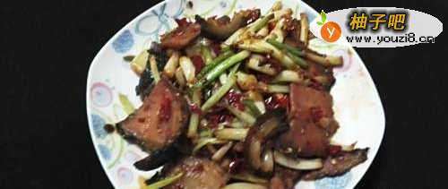 3热锅热油,先将腊肉入锅爆香,再放入备好的荞头同炒。