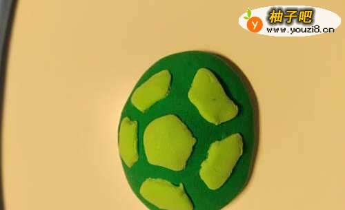5将刻好的浅绿色粘土片按照画的图案贴在龟壳上,龟壳就做好了