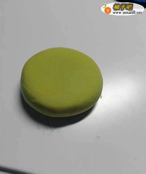 先取一块黄绿色的粘土(这里是蓝色及橙色混合得到的),搓成球形,然后压扁,在一面划出乌龟肚子上的纹路,作为乌龟的肚皮