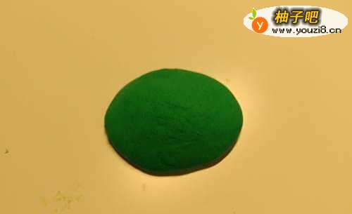 4取深绿色的粘土,搓成球后压扁,要求比之前乌龟的肚子部分面积要大,需要完全能够覆盖,之后取浅绿的粘土做成同样大小的圆片,用来做龟壳上的图案,这里是做的类似于足球的团,用刻刀一片片刻下来