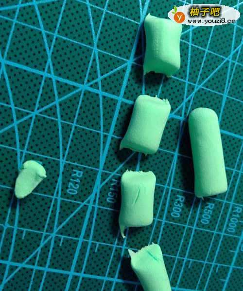 2取绿色的粘土,先搓成长条,然后按照头、四肢、尾巴各自需要的粘土量进行切割,一般为头:四肢:尾巴为2:1:1:1:1:0.3,将切割好的粘土按照各自的用途捏成不同的形状(四肢需要做上爪子,尾巴只需搓成细条即可)