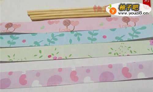 准备几个颜色不一的彩纸长条,和几根棉签棍或者牙签也可以。