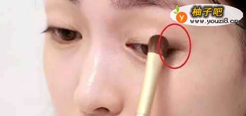 4最后用眼影刷蘸取少量咖啡色眼影,从眼尾开始,沿着睫毛根部轻轻往前扫。记住方向是由后向前,颜色不要重,有一点打阴影的感觉就对了。