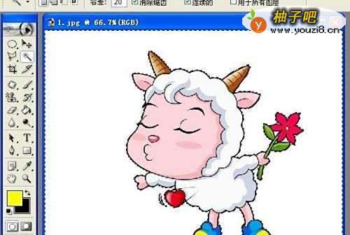 5选择“魔术棒”工具,然后设置好适合的容差。取消“连续的”选项框。如图所示。