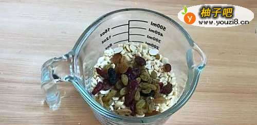 2把花生倒入锅中小火慢炒,炒至花生衣轻轻一捏就能轻松脱离就可以了。稍微放凉后搓去花生衣,然后放入保鲜袋中用擀面杖擀碎(带点颗粒感更好),擀好后放入碗中,再加入适量葡萄干和红糖,拌匀后备用。