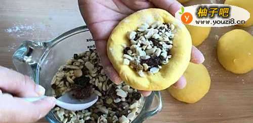 5准备蛋糕模或者碗,底部边缘都均匀地刷上油;取第一个糅好地剂子在手心整成饼状,再放上准备好地花生碎地馅儿,包好,然后收口朝下,放进蛋糕模中,二次醒发至体积明显变大变高。