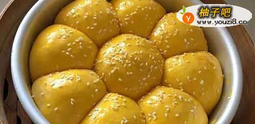 6在二次醒发好的面团上刷上一层蛋黄液,再撒点芝麻点缀增香,然后在蛋糕模上扣上一个大盘子(也可以直接用保鲜膜封好),放入蒸笼,开火上气开始计时,蒸45分钟左右,再焖3分钟即可出锅脱模。
