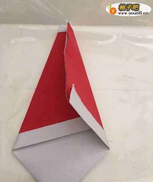 3第三步 重新折上之后 帽尖上就有了一个白三角 然后帽子的当中向右折一道就完成了帽子和头部