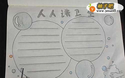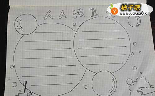 5我们把中间圆形的内部,画上横线留着写字。在最上边,我们写上标题人人讲卫生。
