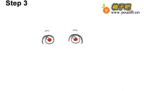 3步骤3:在每个虹膜内侧,在一边画一个小圆圈来表示眩光。在每个虹膜的中间,为小狗的瞳孔画一个大圆点。