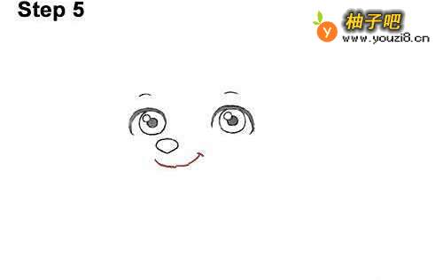 5第5步:在鼻子下面,为卡通小狗的嘴巴画一条长长的弯曲的水平线。