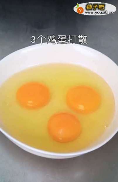 2将提前备好的3个鸡蛋打散,加入少许食盐接着打散。