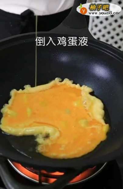 4锅中倒入适量食用油,油温升高后倒入鸡蛋液,同时手不断晃动防止粘锅;将鸡蛋打散、炒熟后捞出备用。