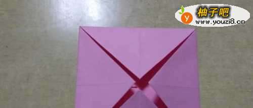 6其他三个角也以同样的方法折成花瓣。然后把有花瓣的一面朝下,花瓣的反面可以看到四个三角形组成的正方形,把这四个三角形往外折,形成包括莲花的形状。