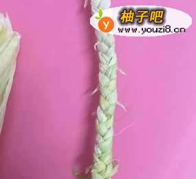 把玉米外面的老叶子去掉,留下嫩一些的,晾晒到微微变黄,叶子柔软的程度,并将顶端连接根部的地方减掉,便于编平整。