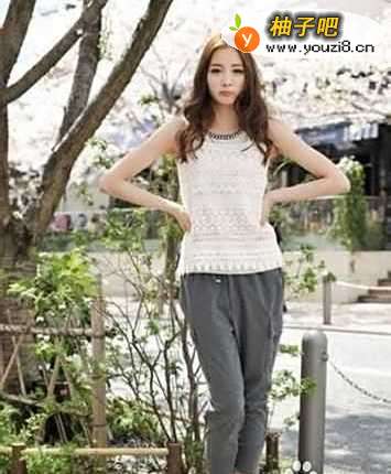 精美的白色蕾丝背心搭配灰色宽松裤,松垮的版型更显随意范儿。背心领部采用金属珋钉装饰,而蕾丝正好中和了珋钉的朋克味道
