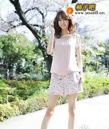 2轻柔的裸色短袖雪纺衫,胸前自然的褶皱正好凸显女性的柔美,搭配素雅的碎花小短裙,清新感十足,特别美。