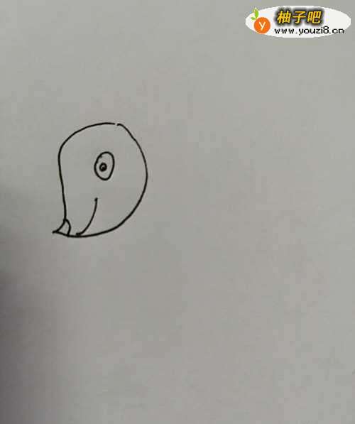 第一步,我们先把可爱的小羊的椭圆形的头画出来,在可爱的小羊的头部里面画出一只黑色的大眼睛。