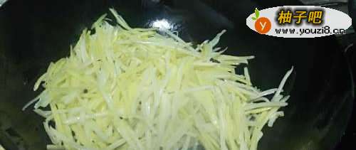2、起锅烧油爆香配料,放土豆丝翻炒。