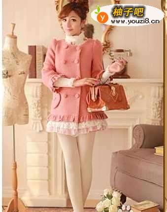 4这款呢子衣很物柱有特色的领部设计,精致的翻领,加上蕾丝的点缀,形成双层领,更有一种娃娃感的甜美气质,修身设计显露出完美的高挑身材。下身搭配粉色小短裙露出裙摆很好看。