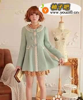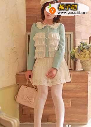 2淡淡的湖绿色毛衣外套,加上蕾丝边毛领,领前和口袋上加了丝带蝴蝶结,更增添了甜美感,蕾丝的小摆裙,显瘦显活力哦。搭配小短靴最漂亮。
